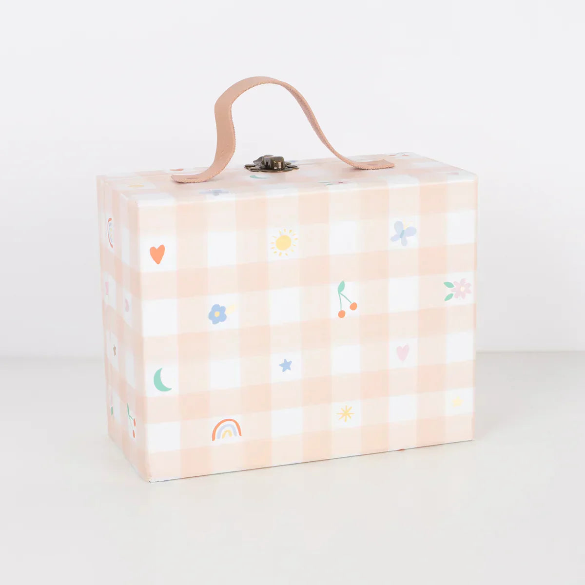 • The pink gingham suitcase is crafted from thick board, with a leather handle and a burnished brass closure